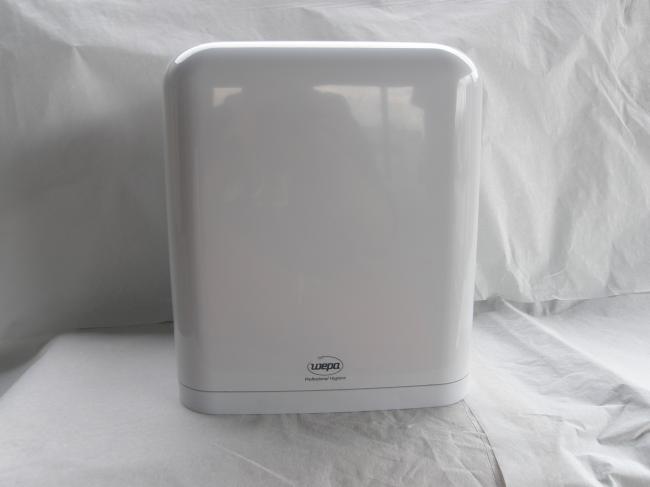 Valkoinen vetopyyhe annostelija keskeltä purkautuviin n.300m kokoisiin rulliin.